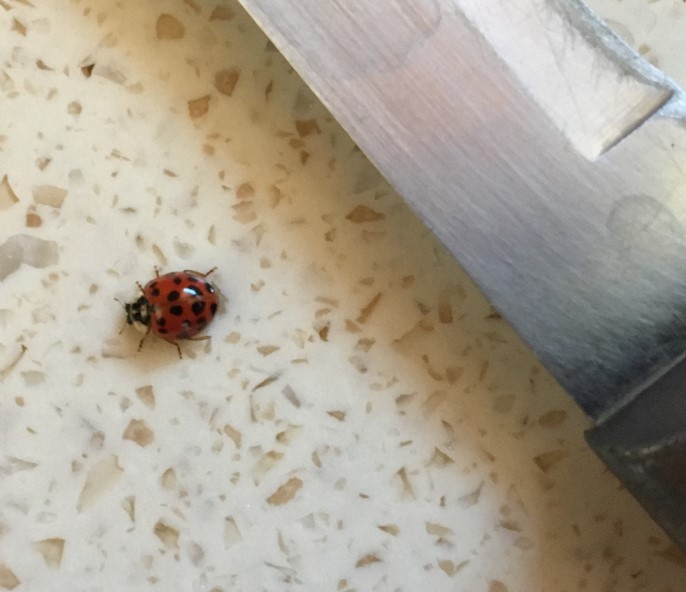 For all I know, the ladybug was not only fine but having a grand old time in there. But still, I couldn’t just leave it there to drown. I dug out a slender quarter-teaspoon measuring spoon, fished the no doubt bewildered bug out of the water, and left it on the kitchen counter to dry.